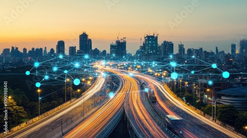 © orendesain99, Fototapeta premium Smart City at Sunset: Connected Highways and Urban Skyline
