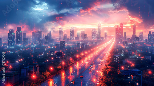 © Klymentii, Fototapeta premium Smart city, big data connection technology. Concept of 5G, IOT, wireless digital connection, internet of things