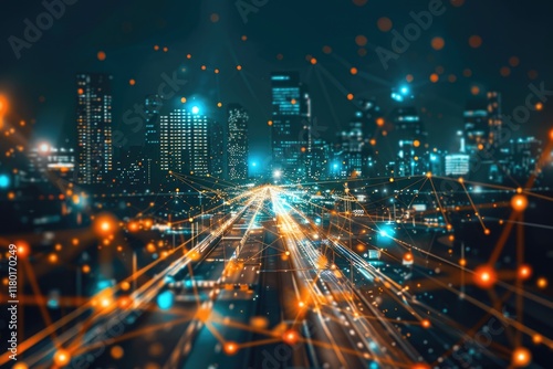 © Anjali, Obraz premium Smart city connectivity through abstract polygon patterns and speed lines.