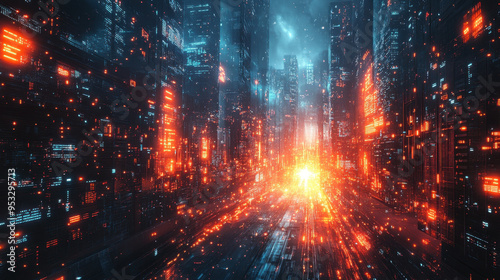 Fototapeta premium Smart City Design, A futuristic city with geometric patterns and fast light...