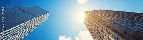 Fototapeta premium Smart City Development with Urban Innovation and Advanced Security Systems, Tall buildings reaching towards a bright blue sky with the sun shining above.
