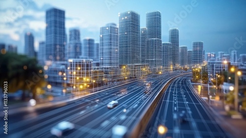 Fototapeta premium Smart city digital concept featuring a wireframe cityscape with futuristic...