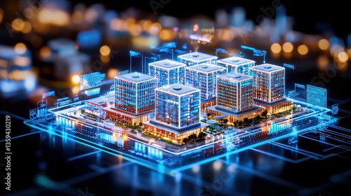 Obraz premium Smart City Digital Model Futuristic Urban Development Illuminated at Night...