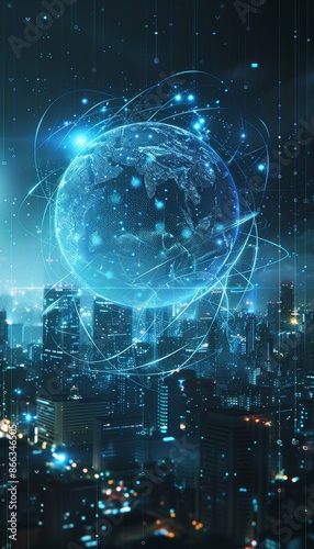 © decorator, Obraz premium Smart city digital realm abstract futuristic network with glowing sphere, urban tech connections