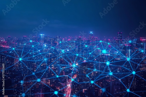 © tammarat, Fototapeta premium Smart city dot point connect with gradient grid line, connection technology metaverse concept Night city banner with big data