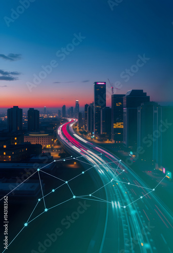 © SusDmi, Fototapeta premium Smart city dot point connect with gradient grid line, connection technology metaverse concept. Night city banner with big data, mindfulness theme, with white tones