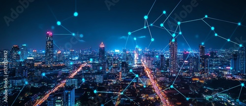 © tammarat, Fototapeta premium Smart city dot point connect with gradient line, connection technology metaverse concept Bangkok, Thailand night city banner with big data