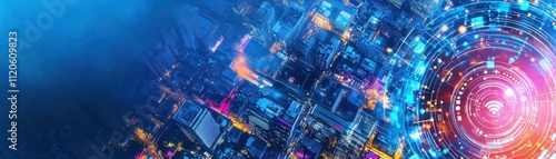 Fototapeta premium Smart city infrastructure with IoT integration, top view, illustrating seamless connectivity, technology tone, vivid color scheme