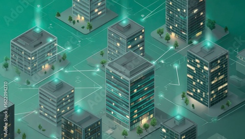 Obraz premium Smart City Network Data Flows Between Buildings at Night