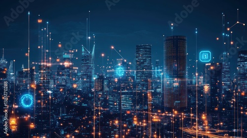 © Waqiah, Fototapeta premium Smart City Night Network Data Flow