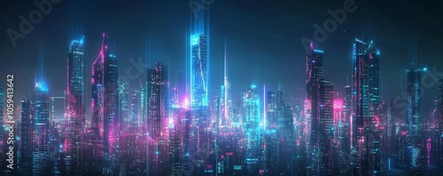 Fototapeta premium Smart city skyline with glowing digital data connection, futuristic and tech-inspired, Smart City, Digital Network, Futuristic Skyline