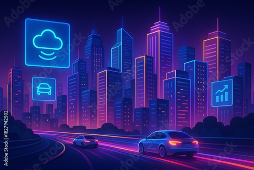Fototapeta premium Smart city skyline with multicolor neon building edges, electric cars leaving...