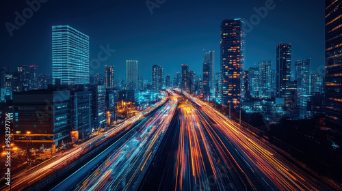 Fototapeta premium Smart City Technology, A modern cityscape featuring geometric designs, dynamic light trails, and advanced data connectivity to illustrate smart city development