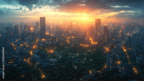 © Ta, Fototapeta premium Smart city visualization with interconnected buildings, showcasing the concept of digital urban transformation.