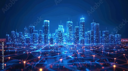 © Ahmad-Muslimin, Fototapeta premium Smart City Wi-Fi Network: Low Poly Wireframe and Building Automatio