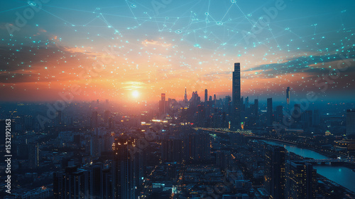 © banlai, Obraz premium Smart city with connection network reciprocity over the cityscape social media networking systems that connects on the peak of success amid tall, innovative Smart city and graphs with statistics