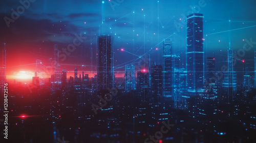 © Teeraphon, Naklejka premium smart, digital, city, connection, network, innovation, Smart digital Innovation city with connection network reciprocity over the cityscape. of future smart wireless digital city and social media netw