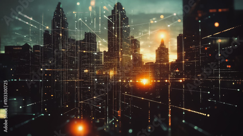 © Teeraphon, Obraz premium Smart digital city with connection cyber security network reciprocity over the cityscape . future smart wireless digital city and social media networking systems that connects people within the city