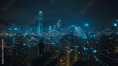 © Teeraphon, Obraz premium Smart digital city with connection cyber security network reciprocity over the cityscape . future smart wireless digital city and social media networking systems that connects people within the city