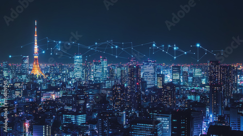 © Teeraphon, Obraz premium Smart digital city with connection cyber security network reciprocity over the cityscape . future smart wireless digital city and social media networking systems that connects people within the city