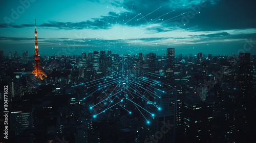 © Teeraphon, Obraz premium Smart digital city with connection cyber security network reciprocity over the twilight cityscape.future wireless digital city and social media networking systems that connects people within the city