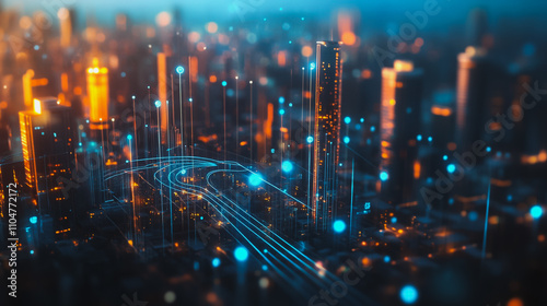 © Teeraphon, Naklejka premium Smart digital city with connection cyber security network reciprocity over the twilight cityscape.future wireless digital city and social media networking systems that connects people within the city