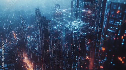 Fototapeta premium Smart digital city with connection cyber security network reciprocity over the twilight cityscape.future wireless digital city and social media networking systems that connects people within the city