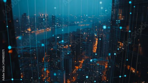 © Teeraphon, Obraz premium Smart digital city with connection cyber security network reciprocity over the twilight cityscape.future wireless digital city and social media networking systems that connects people within the city