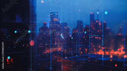 © Teeraphon, Obraz premium Smart digital city with connection cyber security network reciprocity over the twilight cityscape.future wireless digital city and social media networking systems that connects people within the city
