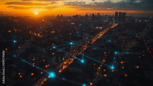 © Teeraphon, Naklejka premium Smart digital city with connection Innovation network reciprocity over the sunset cityscape Concept of future wireless digital city and social media networking systems that connects business people