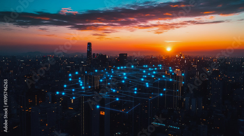 © Teeraphon, Fototapeta premium Smart digital city with connection Innovation network reciprocity over the sunset cityscape Concept of future wireless digital city and social media networking systems that connects business people