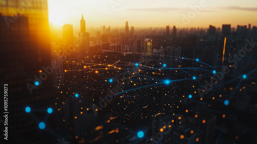 © Teeraphon, Fototapeta premium Smart digital city with connection Innovation network reciprocity over the sunset cityscape Concept of future wireless digital city and social media networking systems that connects business people