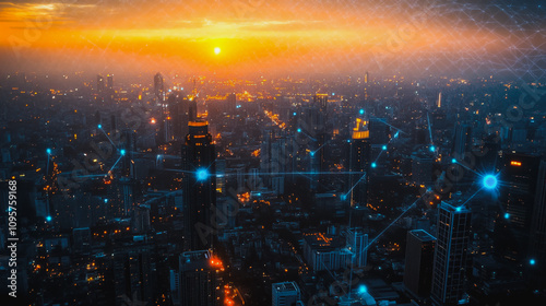 © Teeraphon, Fototapeta premium Smart digital city with connection Innovation network reciprocity over the sunset cityscape Concept of future wireless digital city and social media networking systems that connects business people