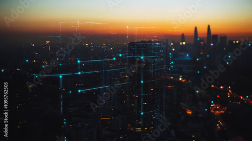© Teeraphon, Naklejka premium Smart digital city with connection Innovation network reciprocity over the sunset cityscape Concept of future wireless digital city and social media networking systems that connects business people