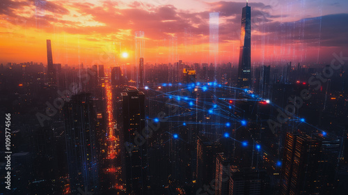 Fototapeta premium Smart digital city with connection Innovation network reciprocity over the sunset cityscape Concept of future wireless digital city and social media networking systems that connects business people