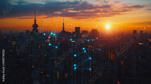 © Teeraphon, Naklejka premium Smart digital city with connection Innovation network reciprocity over the sunset cityscape Concept of future wireless digital city and social media networking systems that connects business people