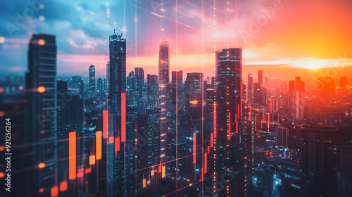 © Teeraphon, Fototapeta premium Smart digital city with connection network that is at the cutting edge of innovation in technology and business with bright, modern skyscrapers. Backgrounds for technology and charts and graphs