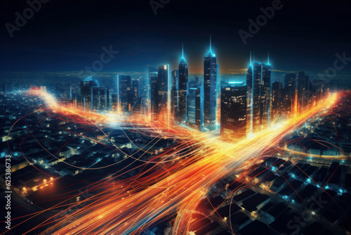Fototapeta premium Smart digital city with high speed light trail