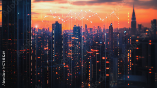 Fototapeta premium Smart digital Innovation city Business skyscrapers in the Financial District with connection network reciprocity over the cityscape. of future smart wireless digital city and social media networking