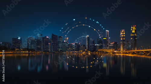 © Teeraphon, Naklejka premium Smart digital Innovation city Business skyscrapers in the Financial District with connection network reciprocity over the cityscape. of future smart wireless digital city and social media networking