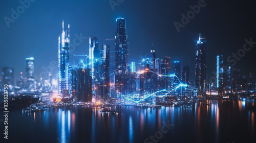 Fototapeta premium Smart digital Innovation city with connection network reciprocity over the cityscape. of future smart wireless digital city and social media networking systems that connects people with in city