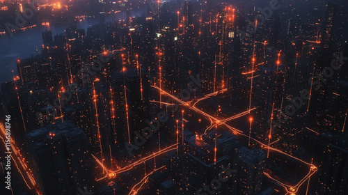 © Teeraphon, Obraz premium Smart digital Innovation city with connection network reciprocity over the cityscape. of future smart wireless digital city and social media networking systems that connects people with in city