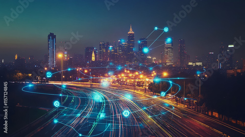 © Teeraphon, Fototapeta premium Smart digital Innovation city with connection network reciprocity over the cityscape. of future smart wireless digital city and social media networking systems that connects people with in city