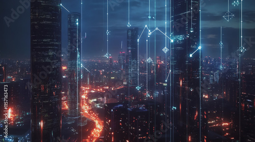 © Teeraphon, Fototapeta premium Smart digital Innovation city with connection network reciprocity over the cityscape. of future smart wireless digital city and social media networking systems that connects people with in city