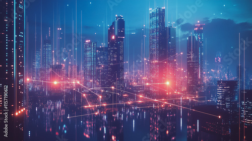 © Teeraphon, Obraz premium Smart digital Innovation city with connection network reciprocity over the cityscape. of future smart wireless digital city and social media networking systems that connects people with in city