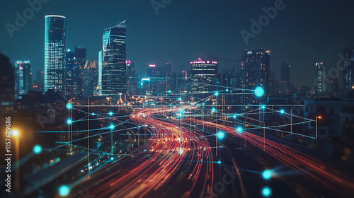 © Teeraphon, Fototapeta premium Smart digital Innovation city with connection network reciprocity over the cityscape. of future smart wireless digital city and social media networking systems that connects people with in city