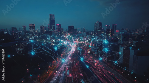 © Teeraphon, Fototapeta premium Smart digital Innovation city with connection network reciprocity over the cityscape. of future smart wireless digital city and social media networking systems that connects people with in city