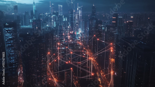 © Teeraphon, Obraz premium Smart digital Innovation city with connection network reciprocity over the cityscape. of future smart wireless digital city and social media networking systems that connects people with in city