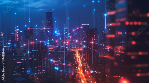 © Teeraphon, Obraz premium Smart digital Innovation city with connection network reciprocity over the cityscape. of future smart wireless digital city and social media networking systems that connects people with in city