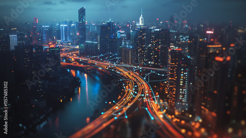 © Teeraphon, Obraz premium Smart digital Innovation city with connection network reciprocity over the cityscape. of future smart wireless digital city and social media networking systems that connects people with in city